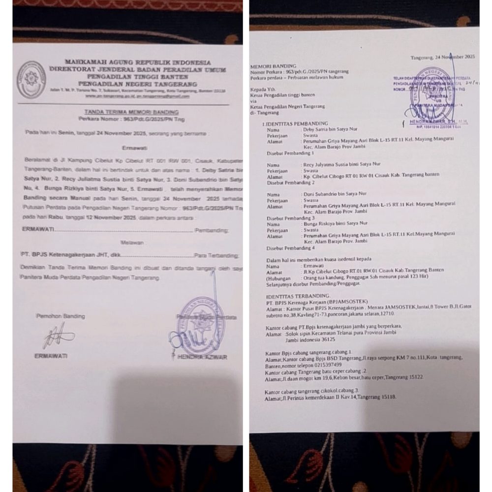 Detektor.News.com | Tangerang, 24 November 2025 — Seorang warga berinisial E, korban dugaan Perbuatan Melawan Hukum (PMH), secara resmi telah mengajukan Memori Banding di Pengadilan Tinggi Banten melalui Pengadilan Negeri Tangerang terkait perkara perdata No. 963/Pdt.G/2025/PN Tng. Langkah banding diambil setelah gugatan tingkat pertama dinilai tidak menyentuh pokok perkara dan tidak memberikan akses keadilan bagi korban.